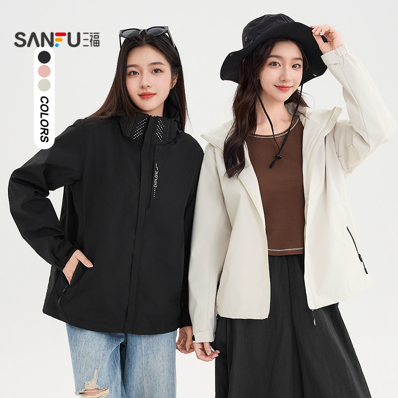 三福冲锋衣女款2025新款夏季可拆卸连帽户外宽松黑色外套上衣女装