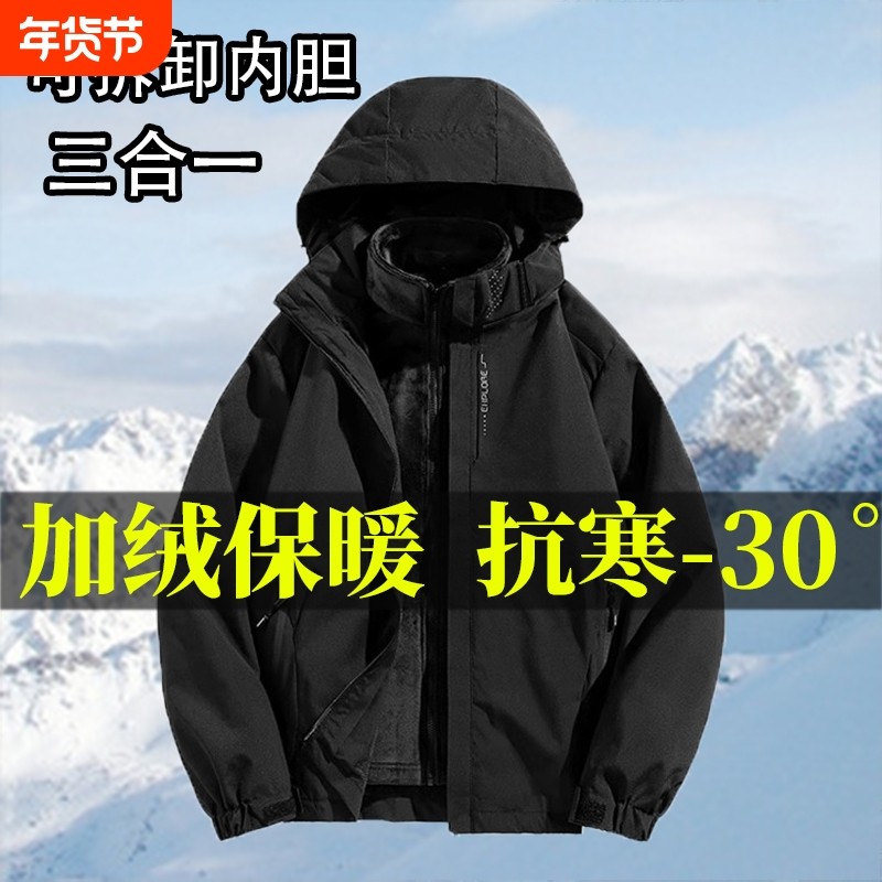 冲锋衣加绒加厚秋冬季外套三合一男女同款白色黑色可拆卸防水防风