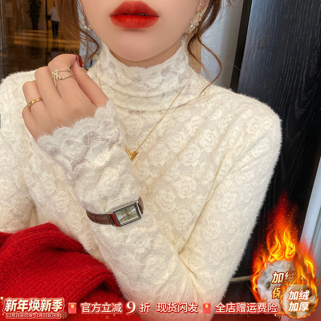 秋冬新款加绒蕾丝打底衫女加厚洋气百搭半高领网纱内搭长袖上衣潮