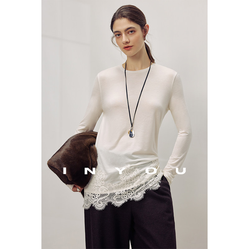 因由 莱赛尔天丝羊毛亲肤拼接蕾丝长袖百搭圆领打底衫T恤上衣女