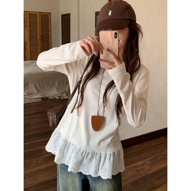 韩系白色蕾丝花边长袖T恤女秋冬款设计感修身内搭显瘦百搭打底衫