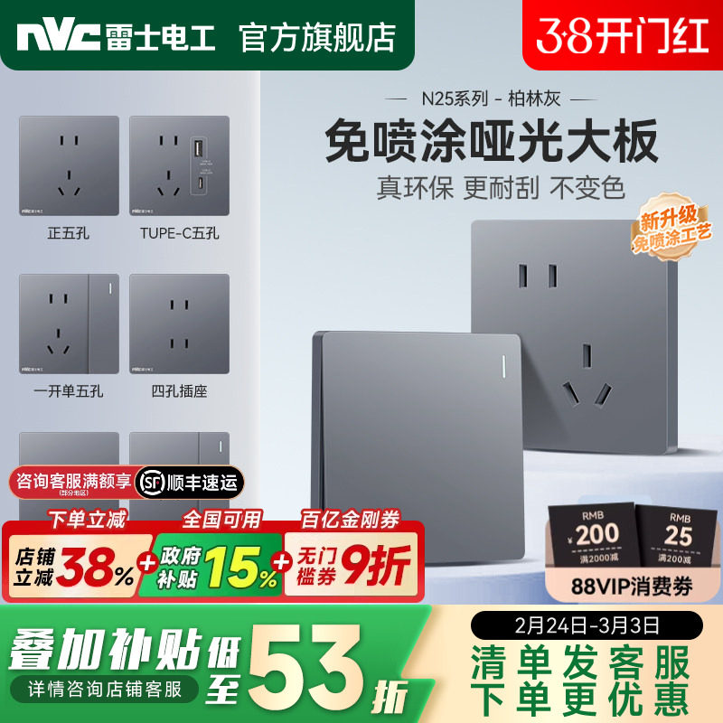 雷士官方开关插座面板86型暗装一开五孔空调三孔电源插座N25灰色