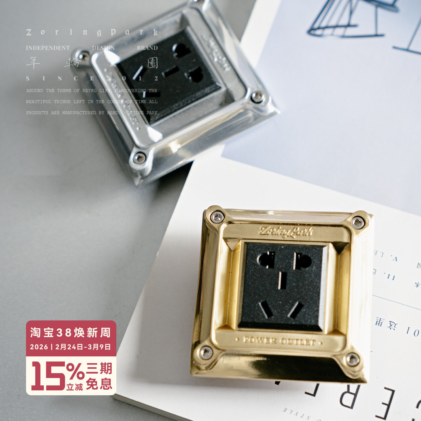 年轮公园-沃尔维奇系列 工业风黄铜铝材边框五孔家用电源插座面板