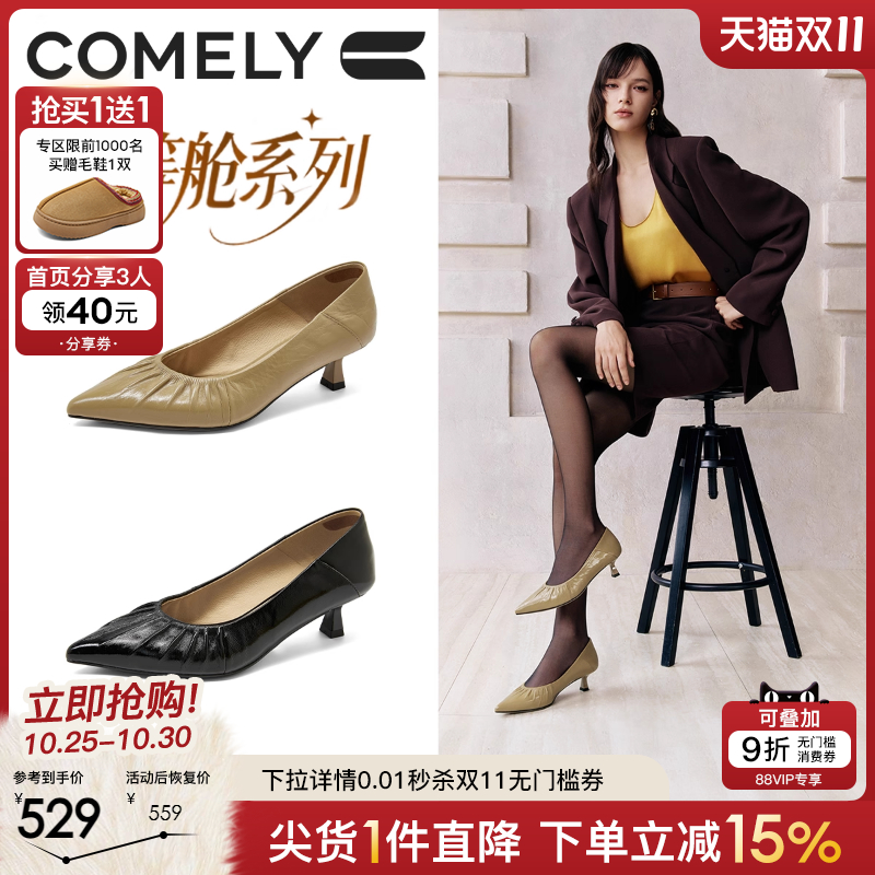 康莉法式浅口单鞋女2025秋季新款尖头褶皱细跟外穿中跟鞋商场同款