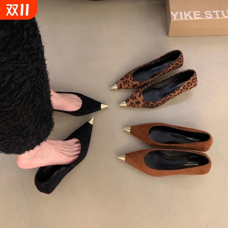 尖头绒面细跟中跟高跟鞋女2025春秋新款法式低跟猫跟瓢鞋浅口单鞋