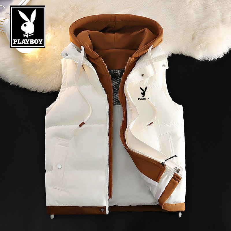 花花公子连帽棉马甲男宽松大码加厚保暖无袖背心青年假两件外套潮