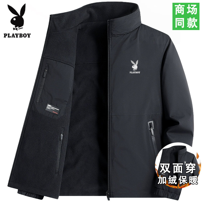 花花公子双面穿夹克男士秋冬季新款防风防水立领外套加绒保暖上衣