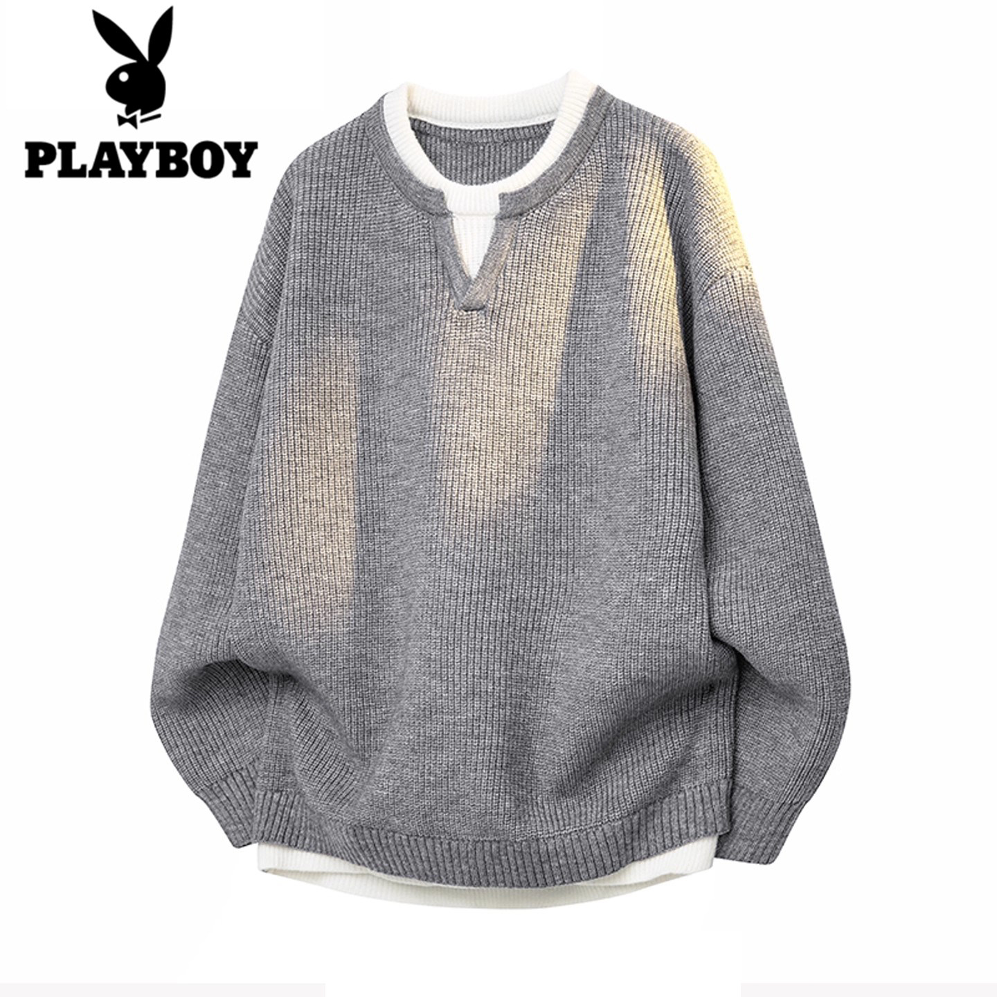 花花公子日系灰色毛衣男生秋冬季新款假两件针织衫高级情侣外套男