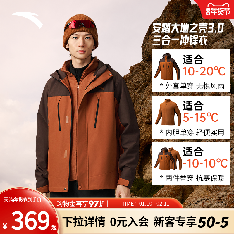 安踏三合一冲锋衣男2025冬季摇粒绒内胆防泼水两件套夹克上衣男款