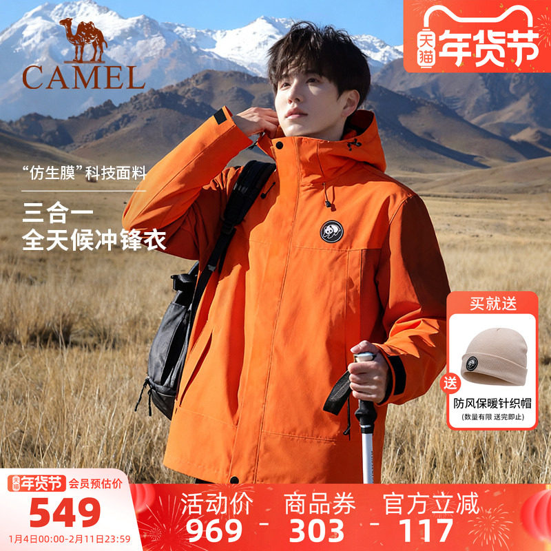 骆驼熊猫雨壳羽绒三合一冲锋衣男秋冬新款户外防风保暖登山服外套