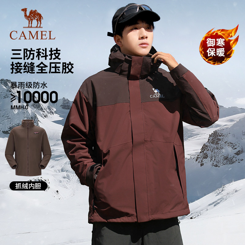 骆驼户外可收腰三合一冲锋衣男女防风防水加绒加厚抓绒内胆两件套