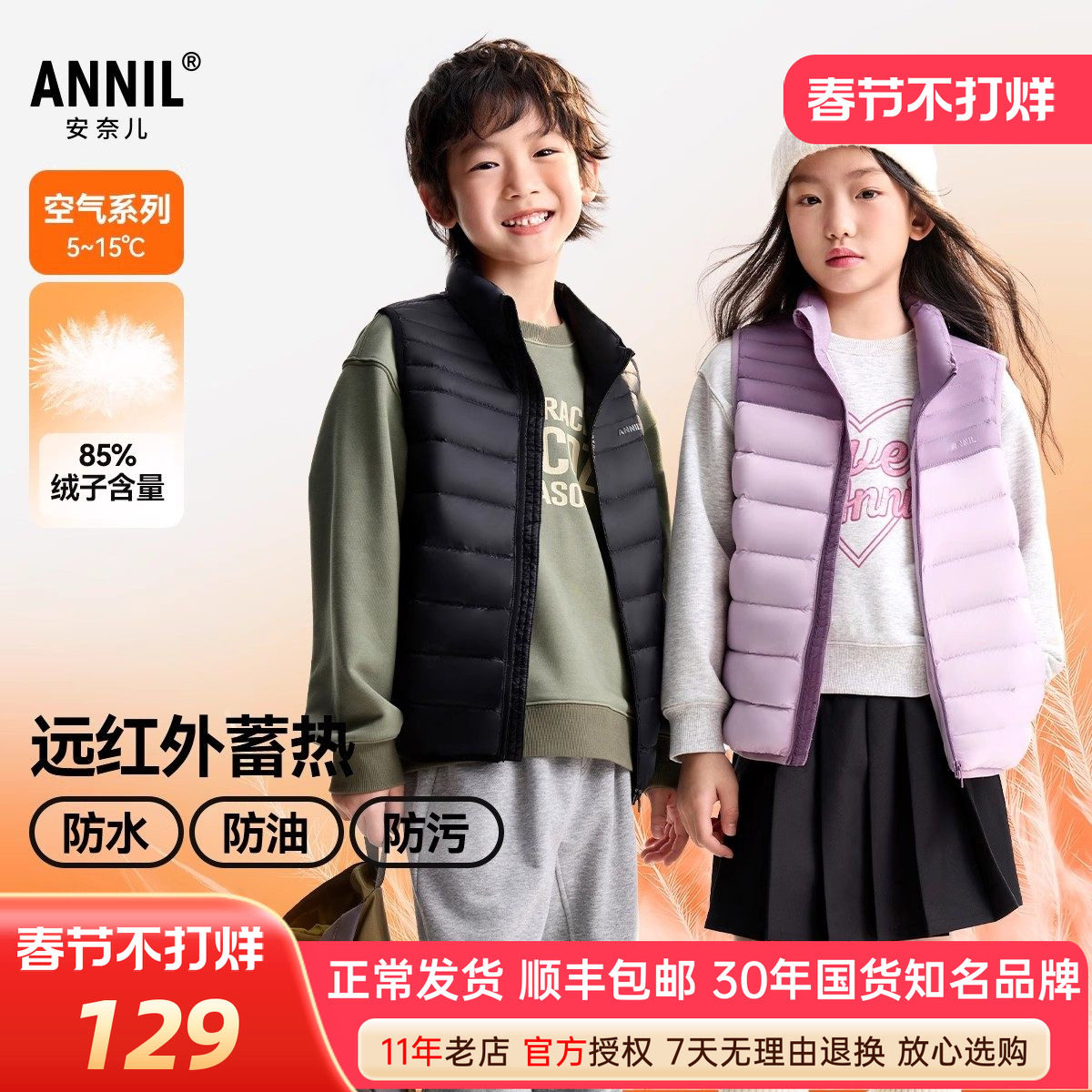 安奈儿男女童装短款轻薄羽绒马甲2025冬新款保暖背心坎肩百搭三防