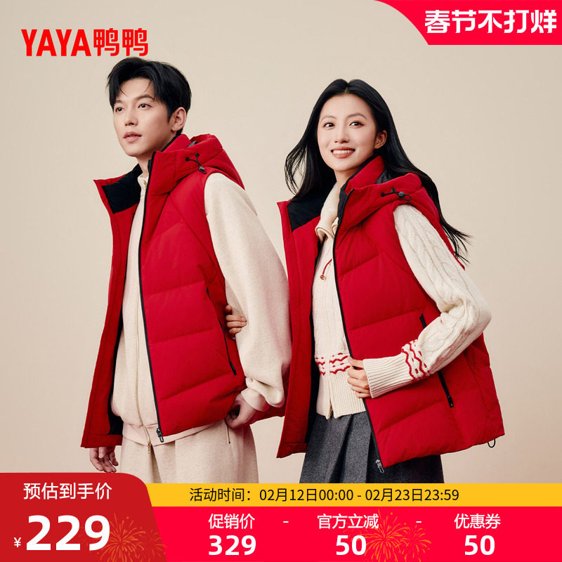 鸭鸭羽绒马甲男女同款秋冬新品短款加厚百搭休闲连帽红色鸭绒外套