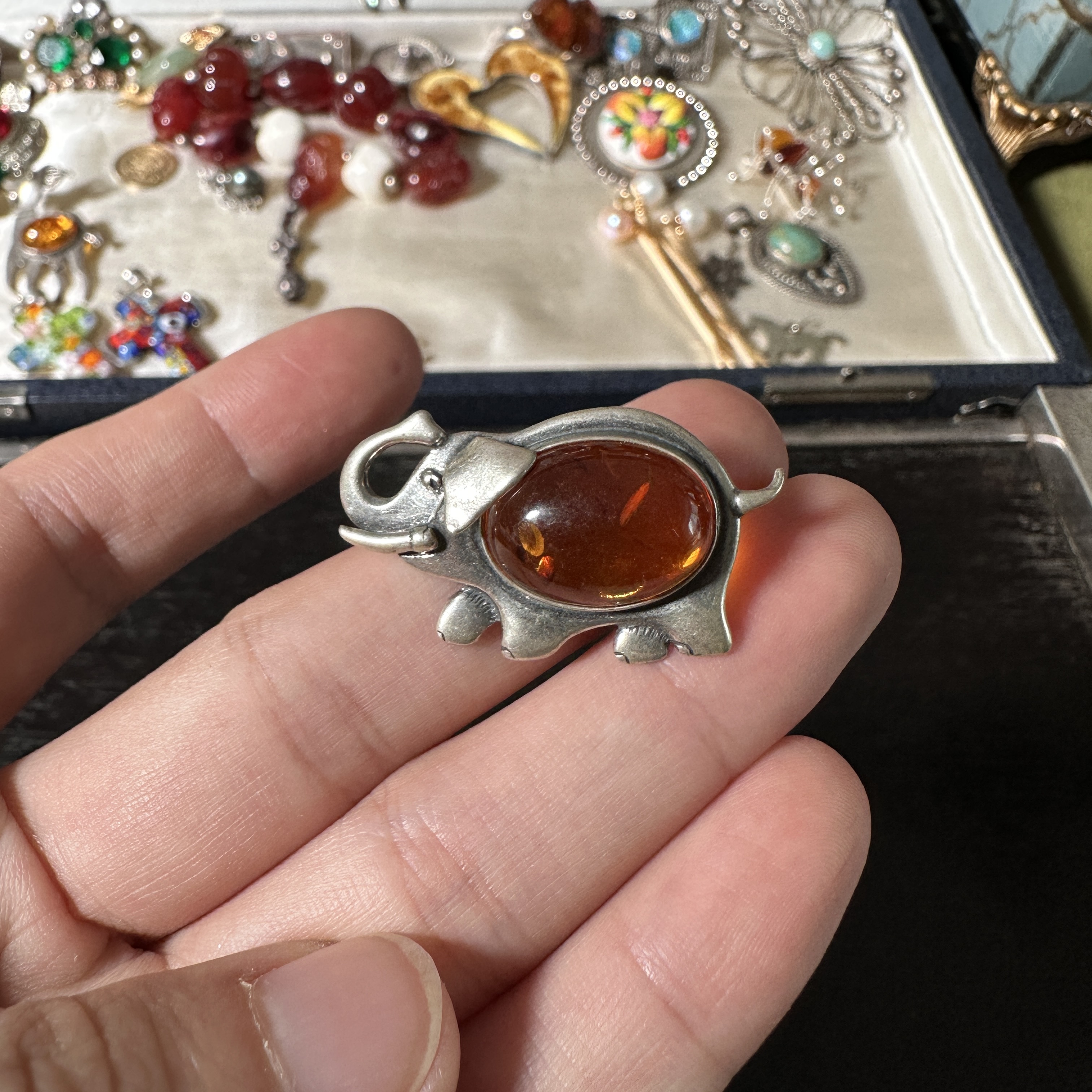 西洋古董银器vintage中古首饰海外回流天然琥珀花珀纯银小象胸针