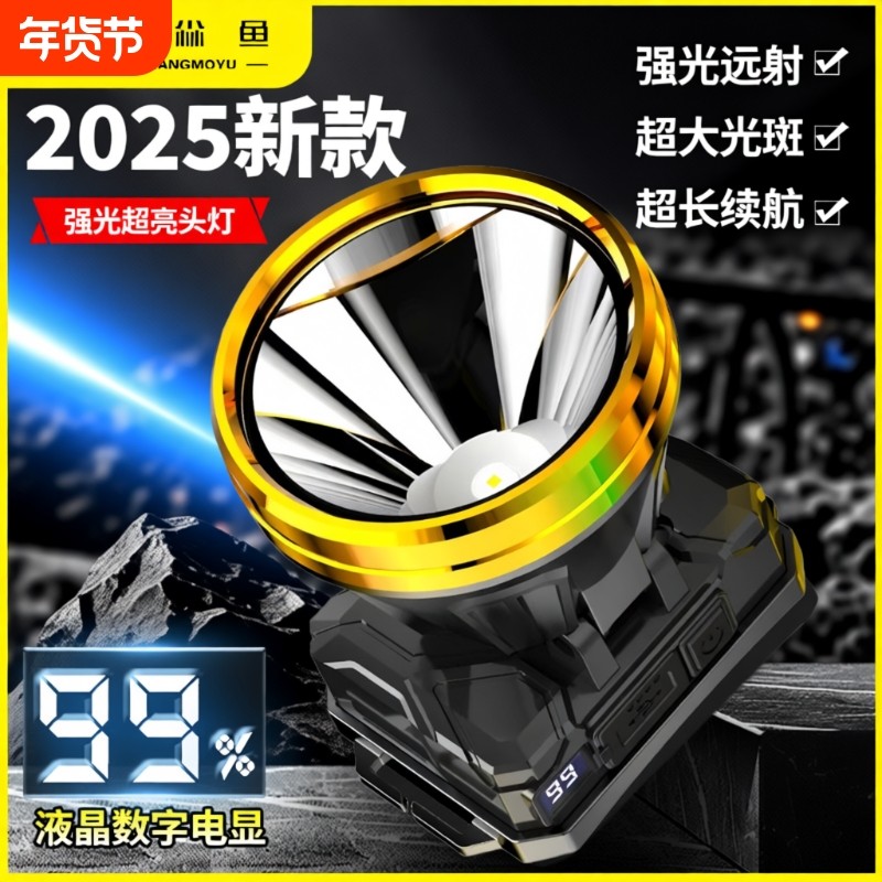 2025强光头灯充电超亮远射防水照明灯led黄光户外矿灯头戴式电筒