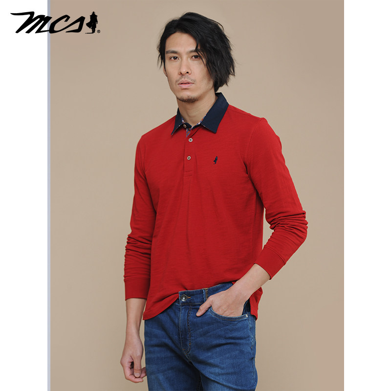 MCS男装美式翻领全棉长袖T恤男百搭polo衫中年父亲装体恤衫男春款