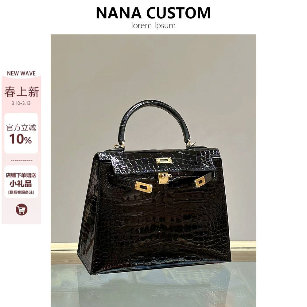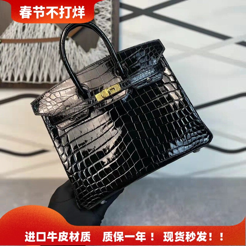 鳄鱼皮铂金包 牛皮鳄鱼纹高端光面方块真皮手提女包凯莉包25 30CM