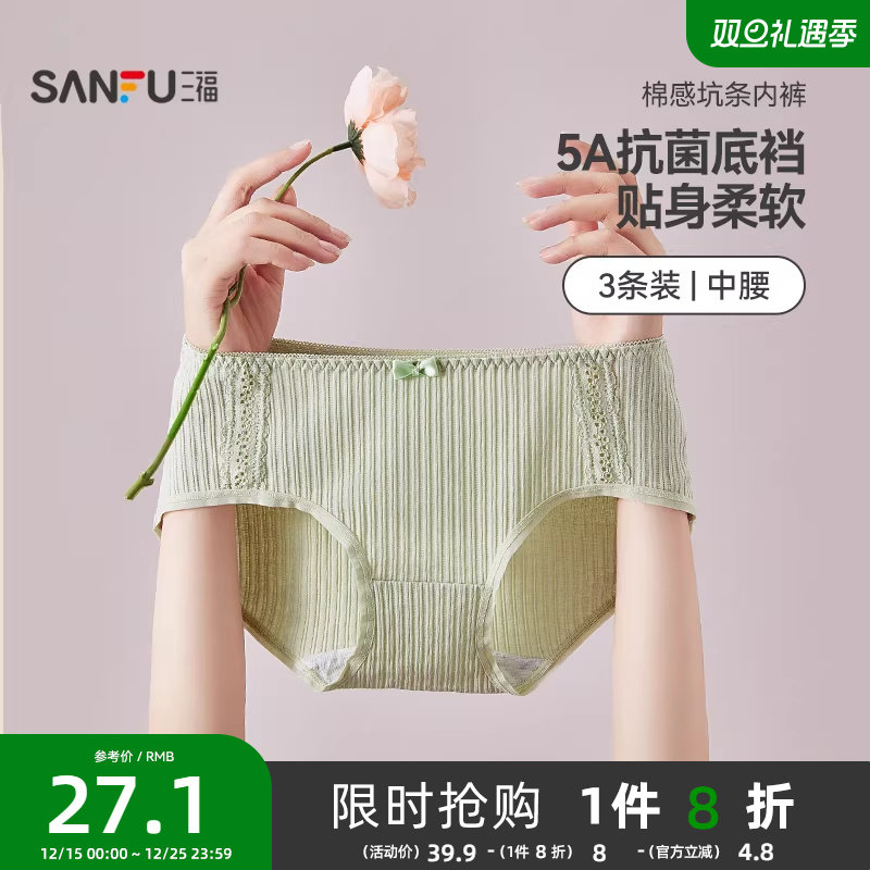 [3条]三枪小仙女内裤女无痕中腰纯棉裆10A抗菌花边纯欲三角裤学生