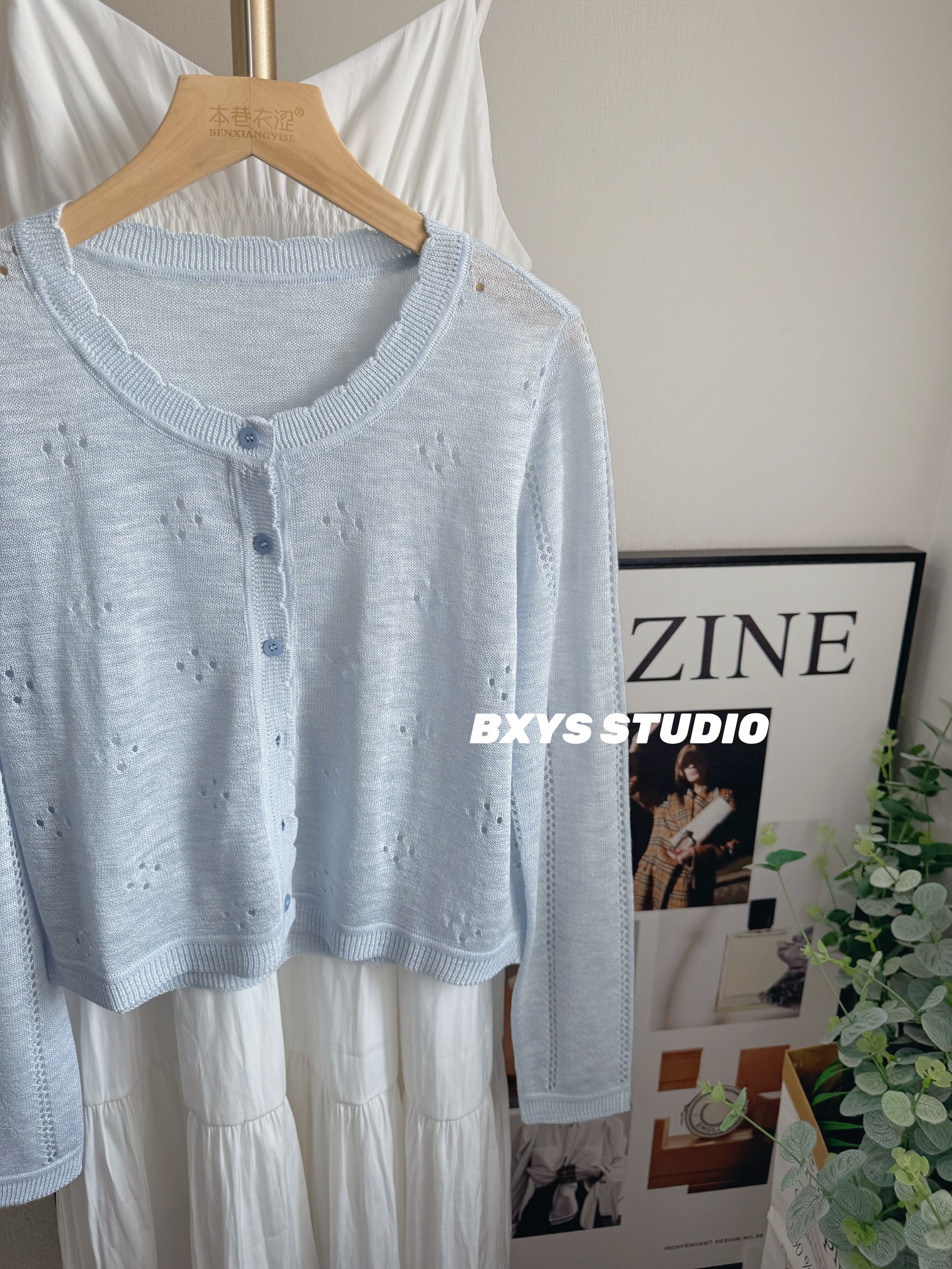 黛薇璐媤白针织小开衫配编绳吊带连衣裙女夏季新款蓝花度假2件套