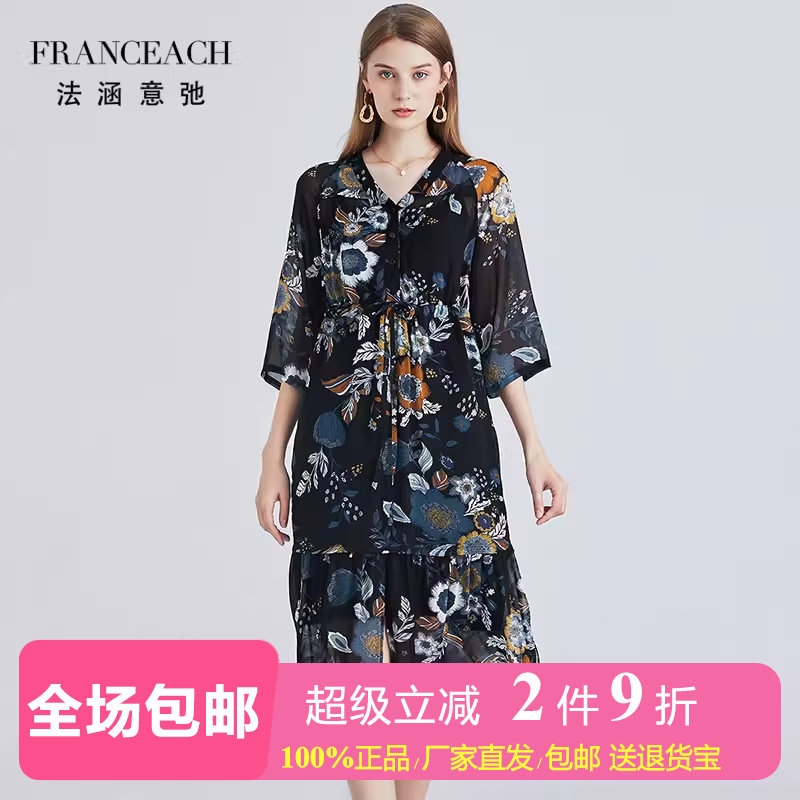 法涵意弛2件套裙装套装中年妈妈黑色七分袖桑蚕丝印花连衣裙+吊带