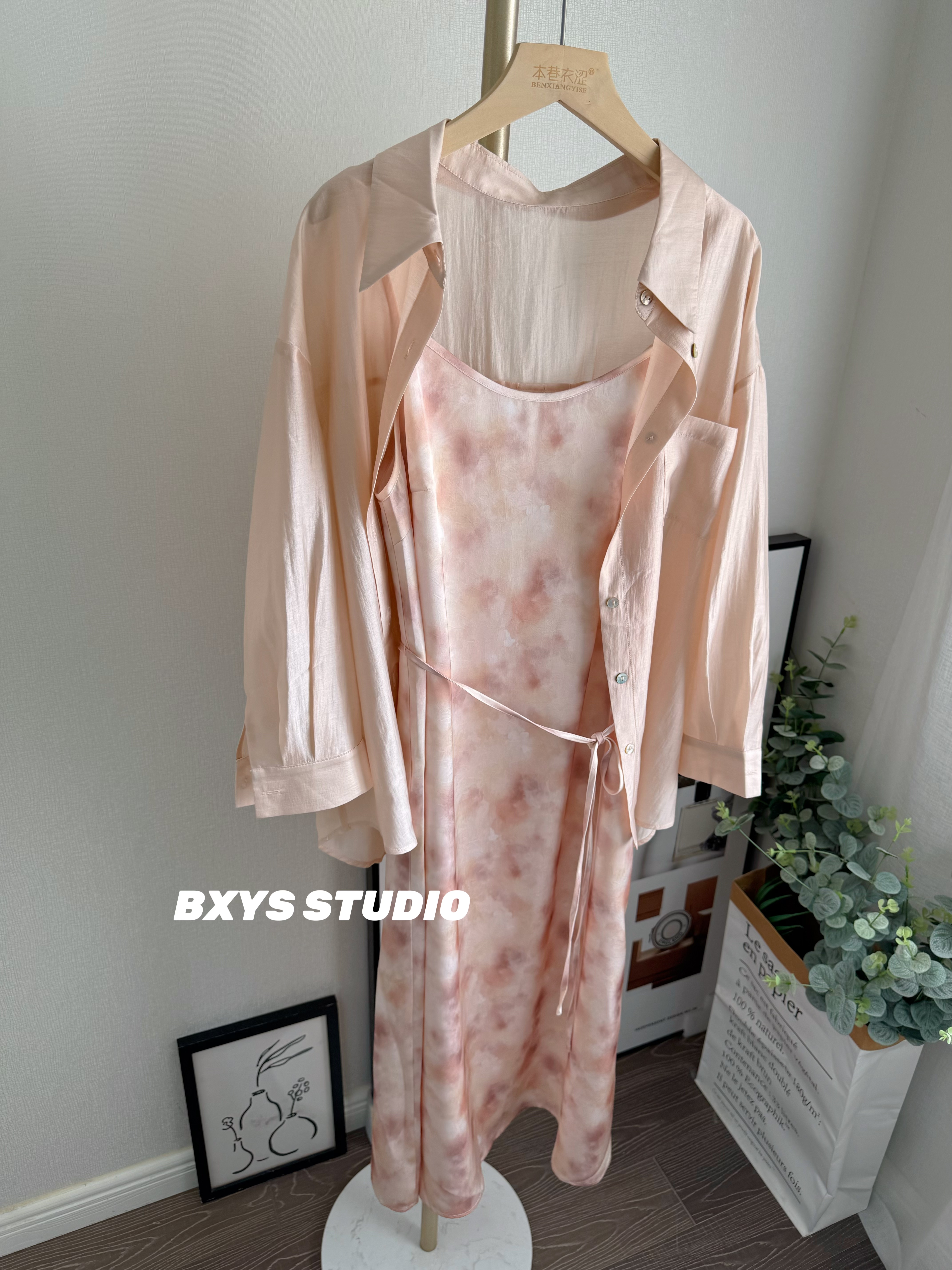 本巷衣涩2026年春季新款宽松衬衫上衣扎染吊带连衣裙2件套套装女