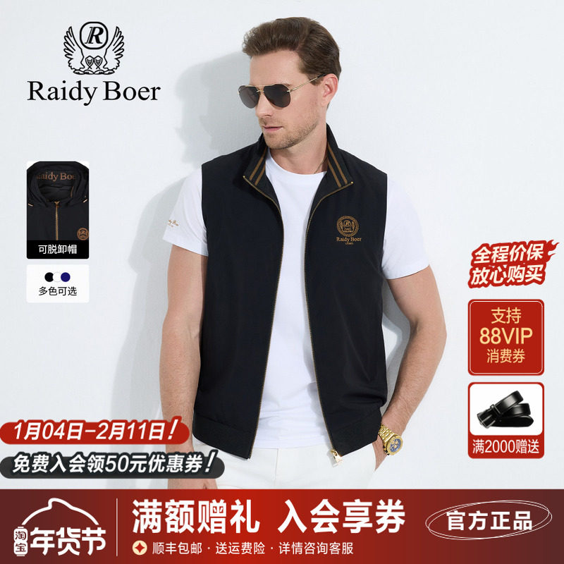 雷迪波尔男装背心2025春秋新款可脱卸帽拉链刺绣休闲纯色户外马甲