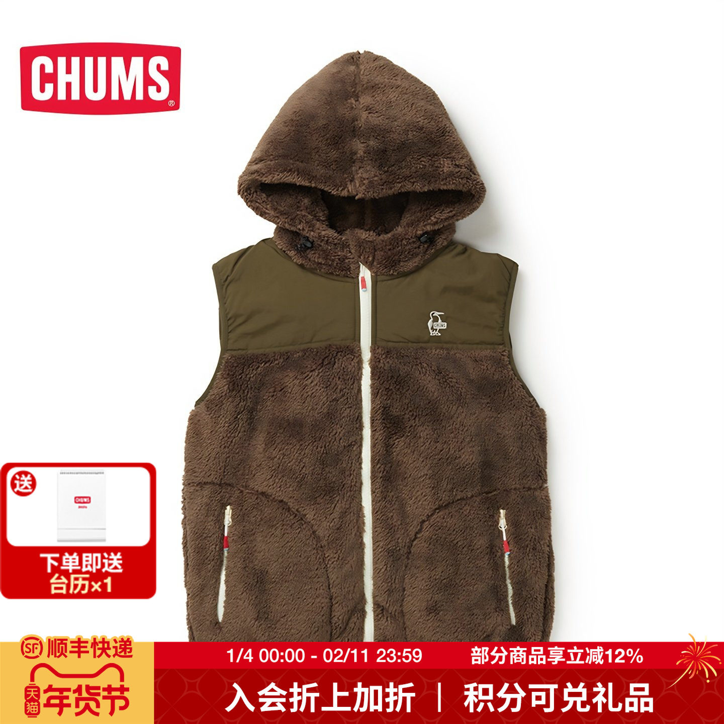 CHUMS/洽洽鸟 新款抓绒衣女秋冬户外马甲背心坎肩外套男CH04-1362
