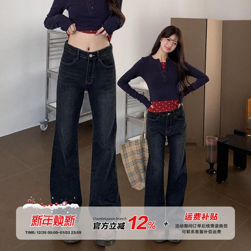 LILY2025秋冬小个子女款复古美式修身加绒休闲高腰微喇叭牛仔长裤