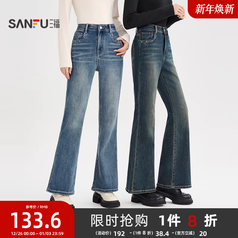 三福牛仔长裤2025新款冬季保暖抓绒高腰喇叭裤显瘦裤子女装513448