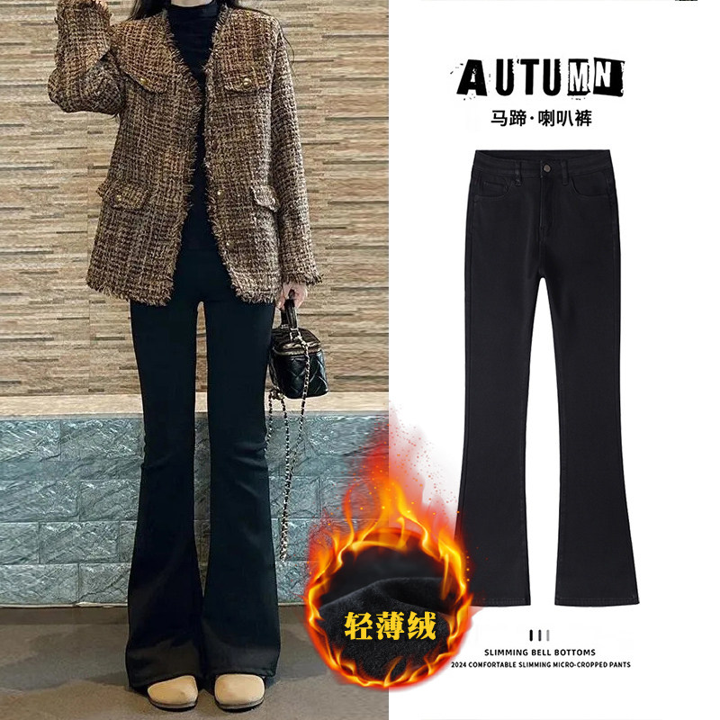 逸阳高腰微喇牛仔裤女2025年冬季新款加绒修身显瘦小喇叭保暖长裤