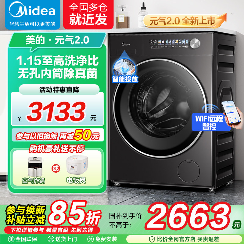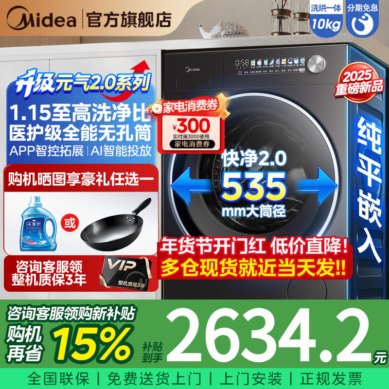 美的滚筒洗衣机元气2.0全自动家用10公斤除真菌洗烘一体官方正品