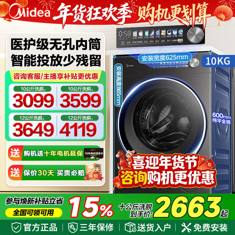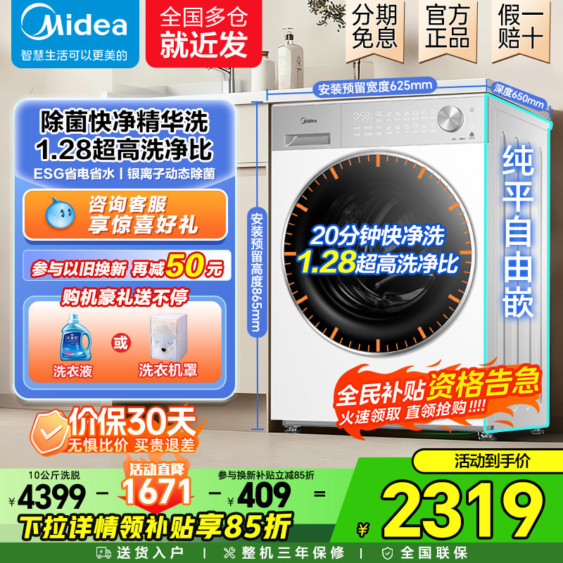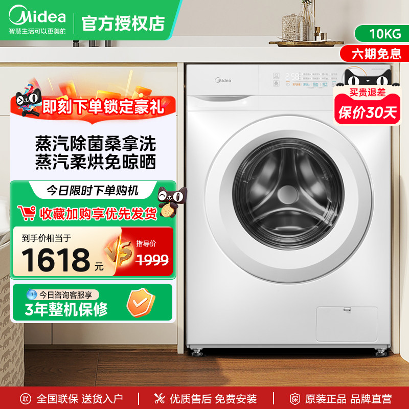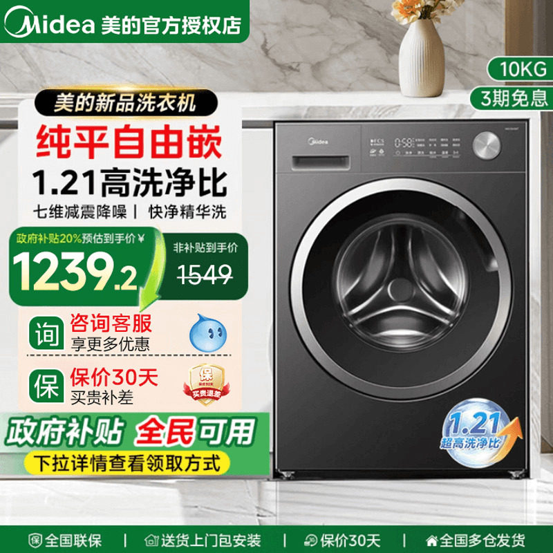 全民补贴美的滚筒洗衣机10kg全自动家用纯平自由嵌除菌螨净渍新品
