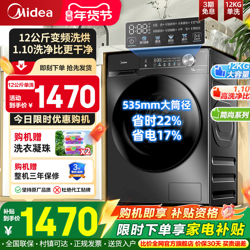 全民政府补贴美的12/10kg除菌全自动大容量洗脱烘一体滚筒洗衣机