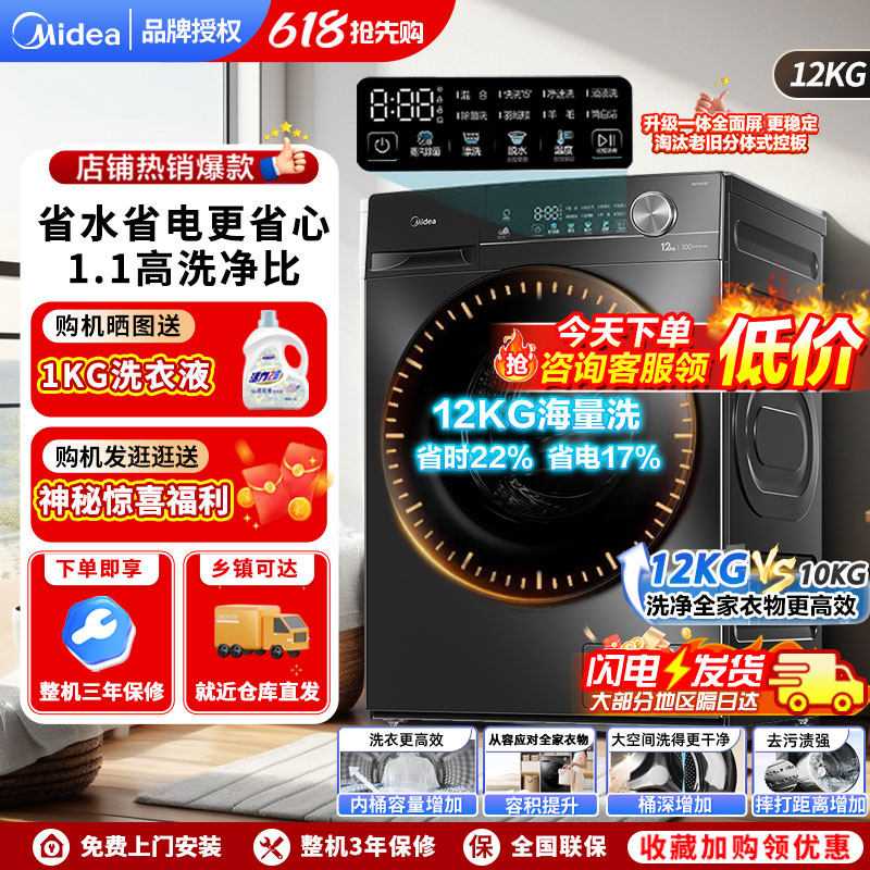 【全民补贴】美的12/10kg大容量家用全自动洗脱烘一体滚筒洗衣机
