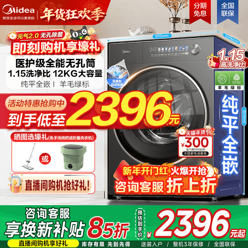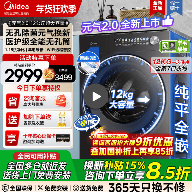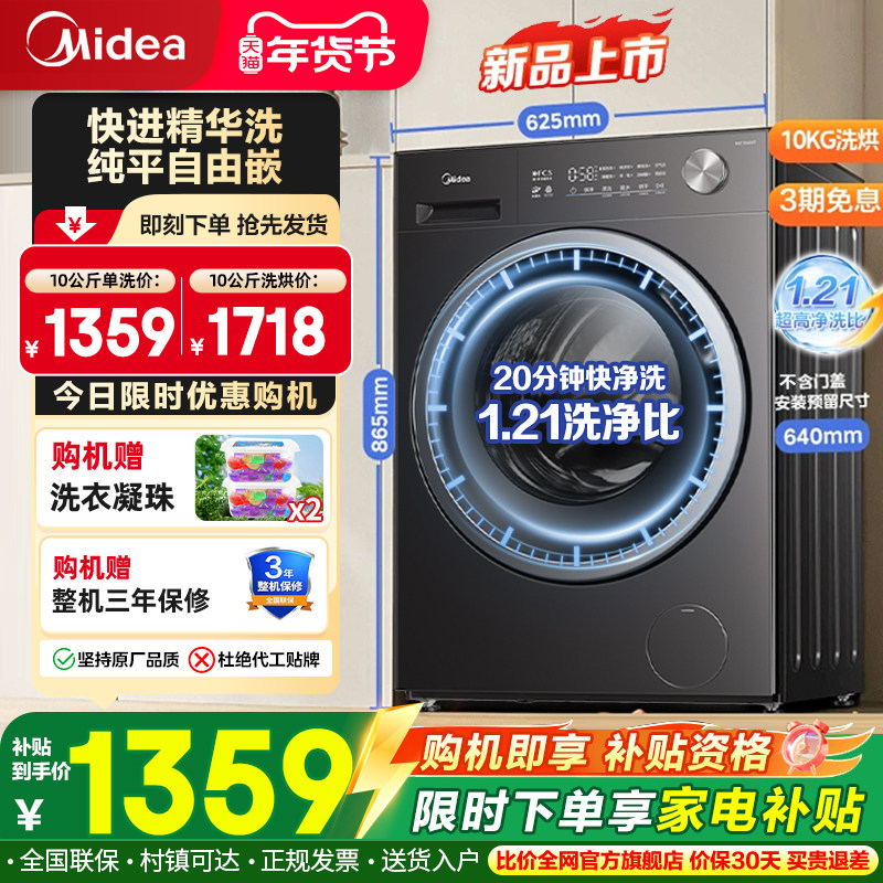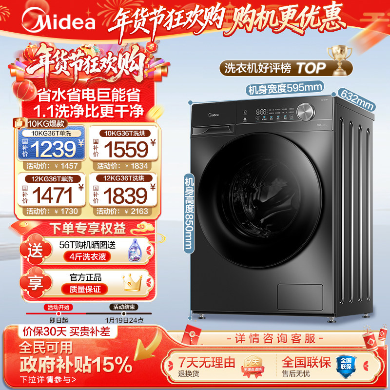 【全民补贴】美的10/12kg洗衣机1.1洗净比全自动除菌螨滚筒洗烘36