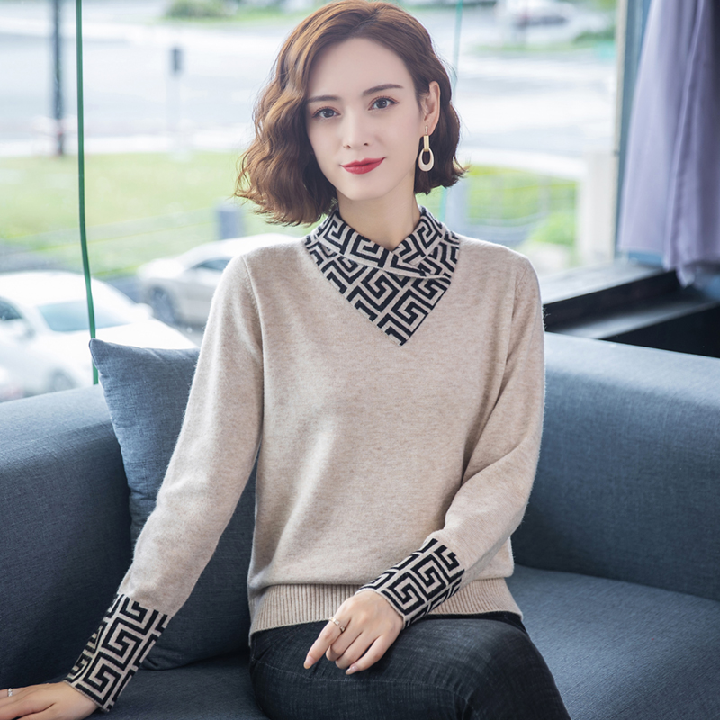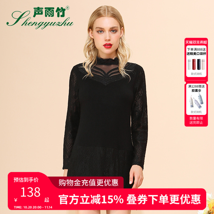 声雨竹知性纯色优雅秋款半高圆领钉珠拼蕾丝气质长袖套头毛针织衫