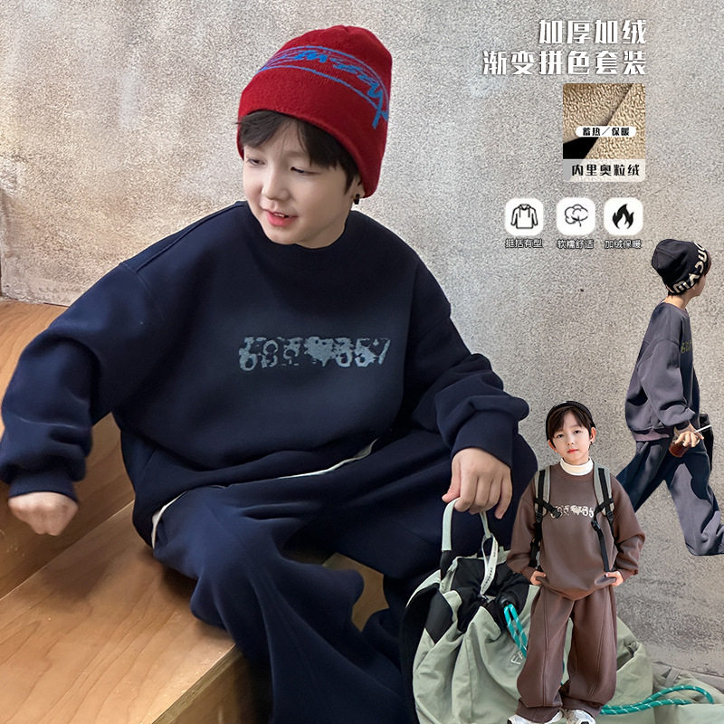 加绒加厚儿童卫衣套装2025冬男女童韩版保暖奥粒绒字母运动两件套