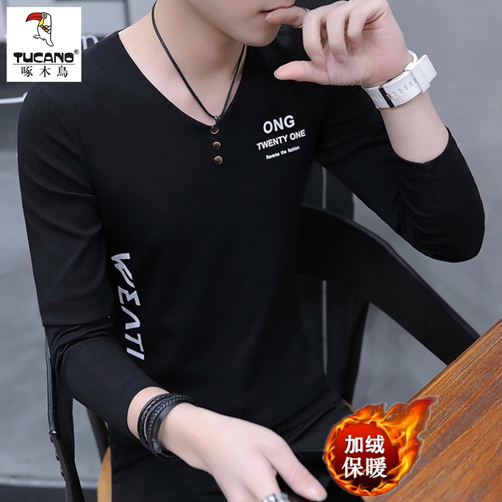 啄木鸟男士v领长袖t恤春秋季体恤小衫冬季薄绒内搭保暖打底衫上衣