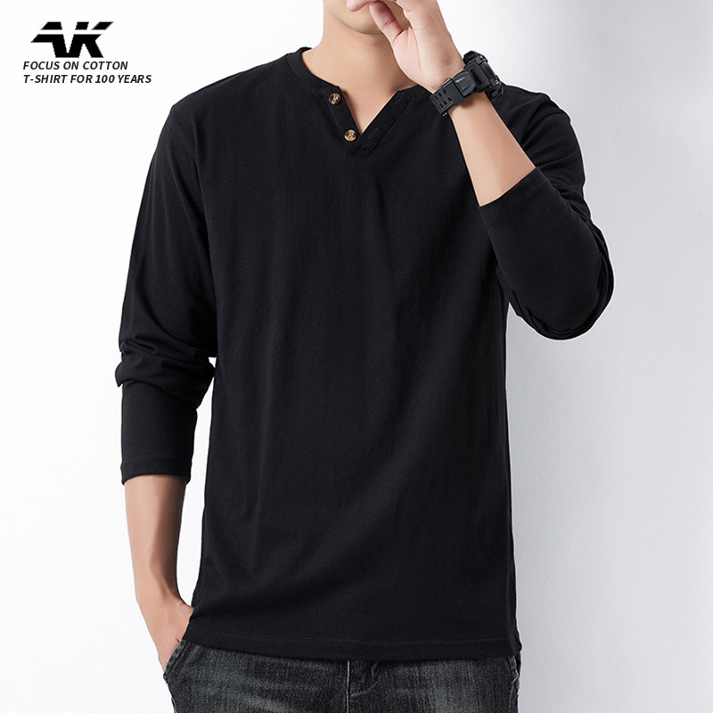 2025男士秋季长袖T恤纯棉V领扣子体恤潮流男装学生上衣服打底衫