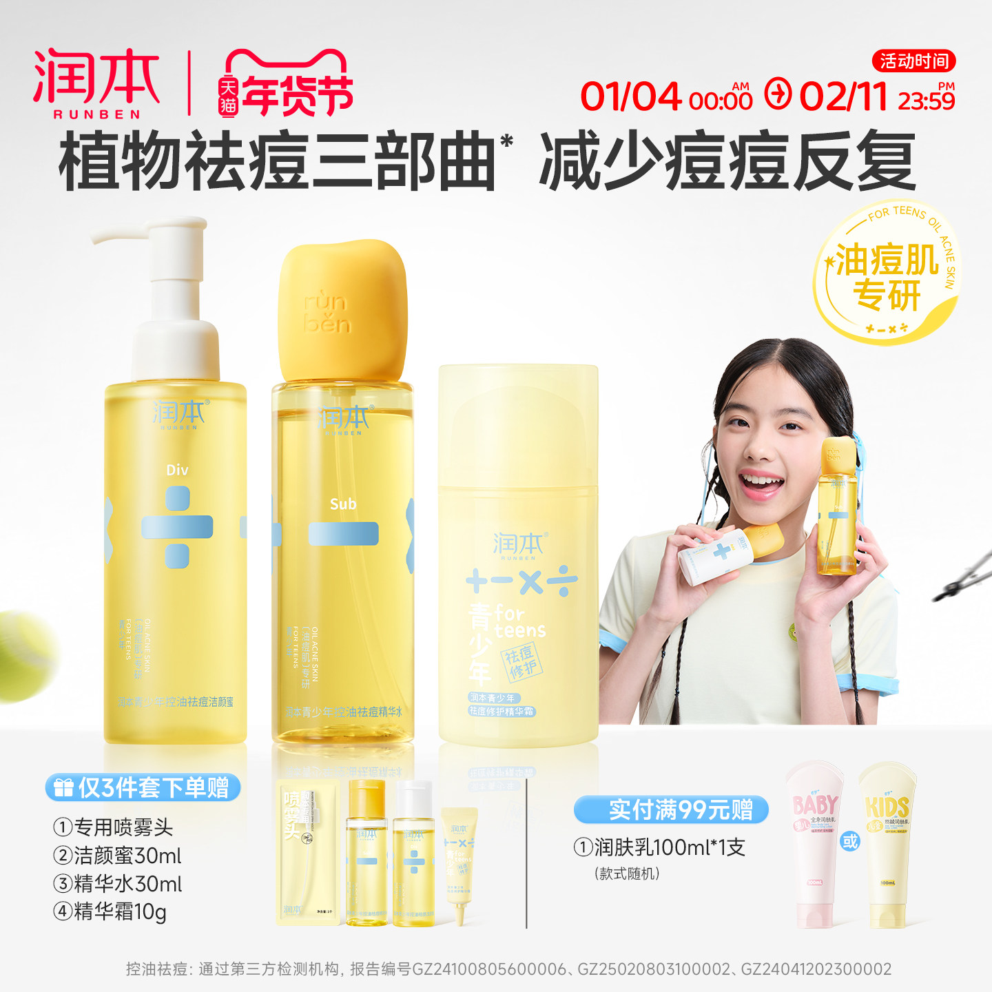 润本青少年控油祛痘精华爽肤水女孩去闭口粉刺缩毛孔学生护肤套装