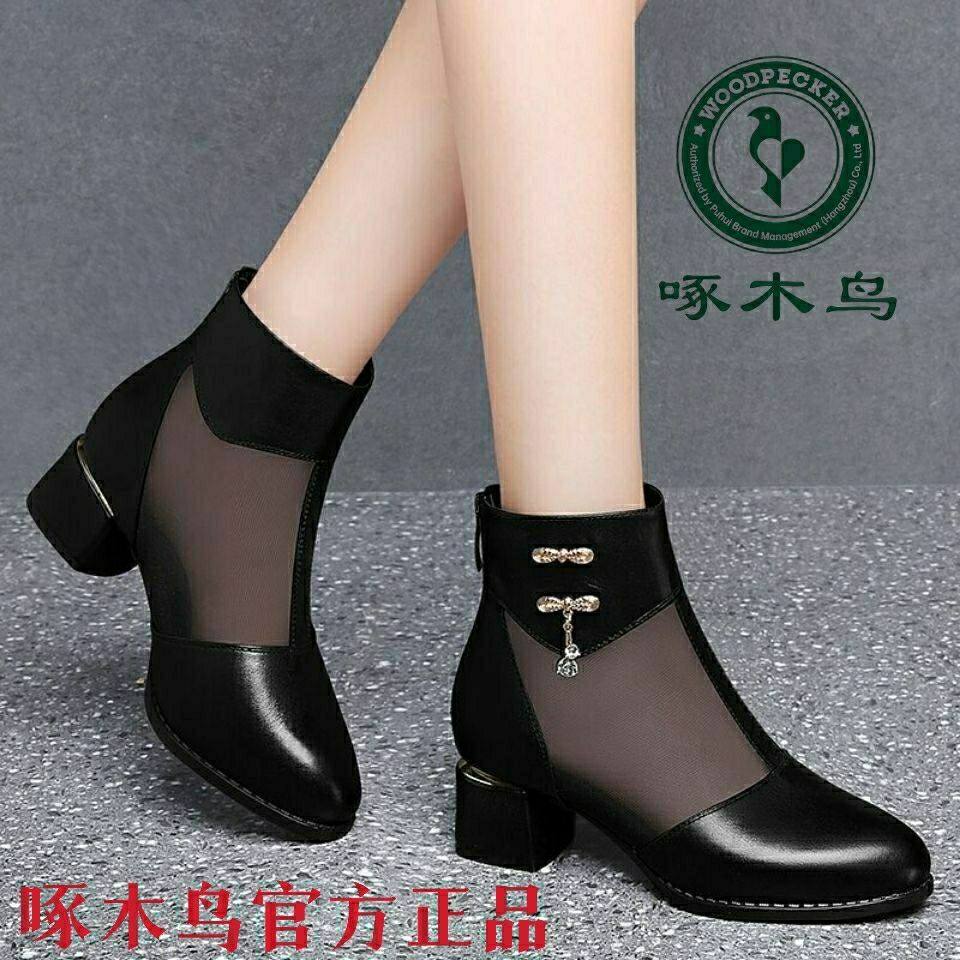 啄木鸟真皮粗跟凉靴皮鞋女网鞋夏季鞋子透气2024新款中跟网纱凉鞋