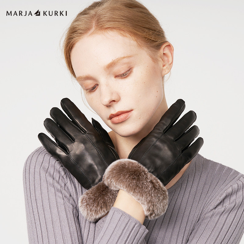 MARJAKURKI玛丽亚古琦黑色羊皮真皮手套女士冬季触屏兔毛保暖手套