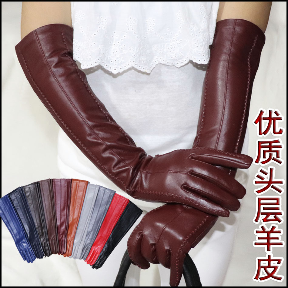 真皮手套女羊皮长款冬保暖过肘加绒加厚薄手臂套皮袖套触屏黑彩色