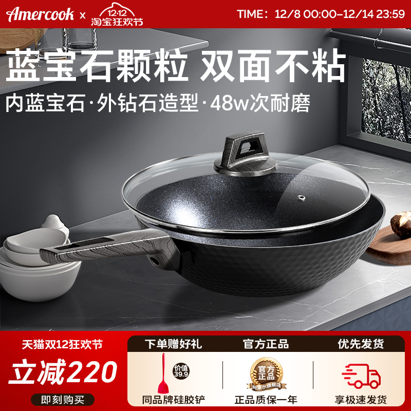 Amercook麦饭石家用无油烟钻石平底不粘锅炒菜锅电磁炉燃气灶通用