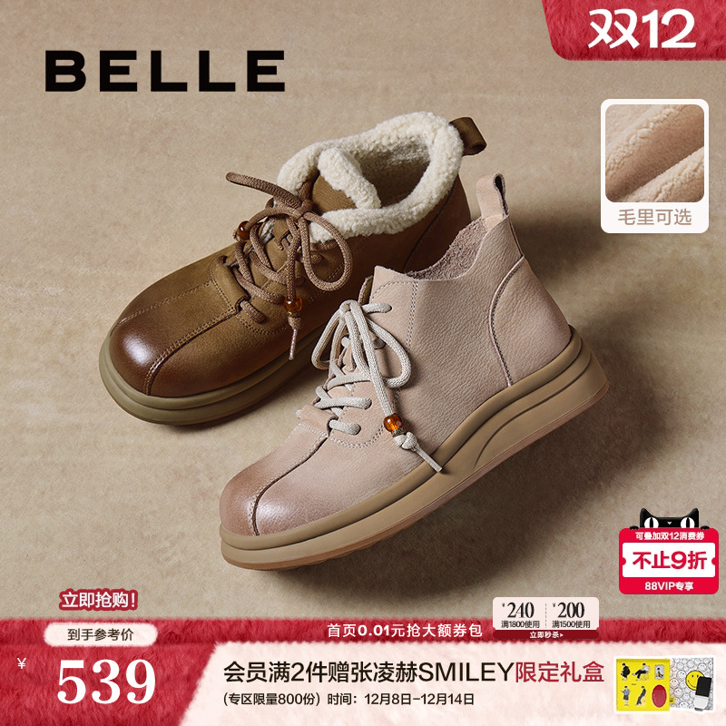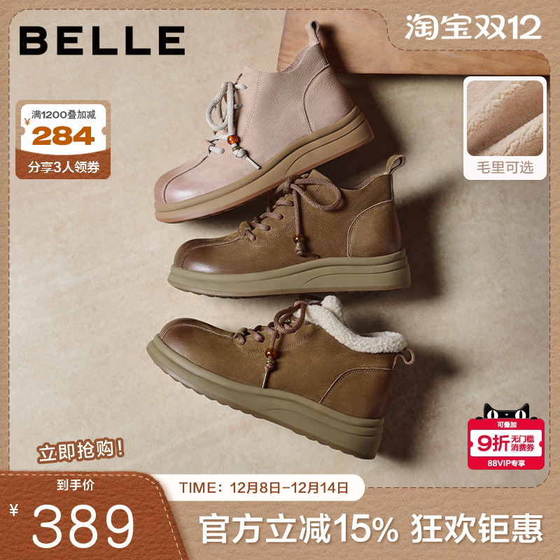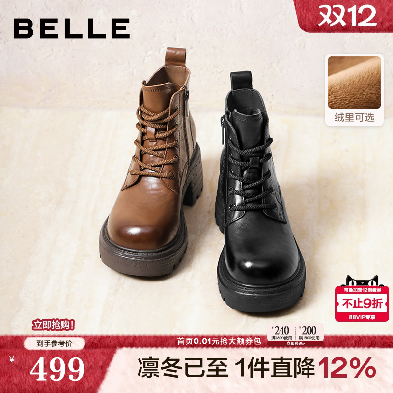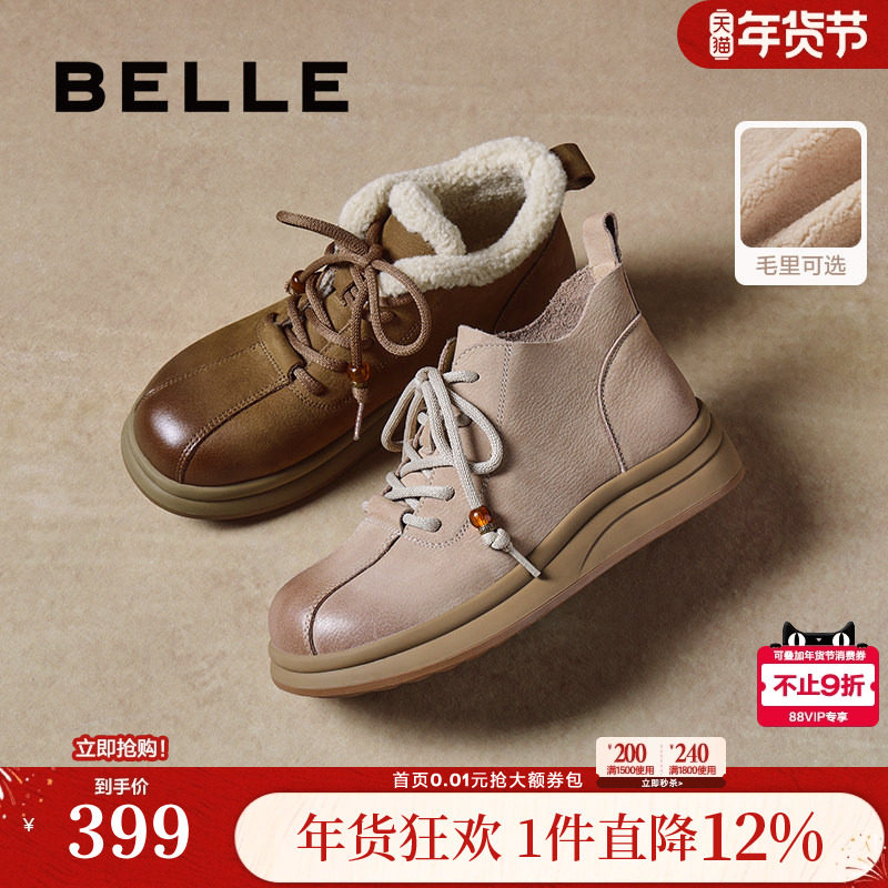 百丽英伦风真皮马丁靴子女冬款加绒保暖厚底休闲短靴B2942DD5