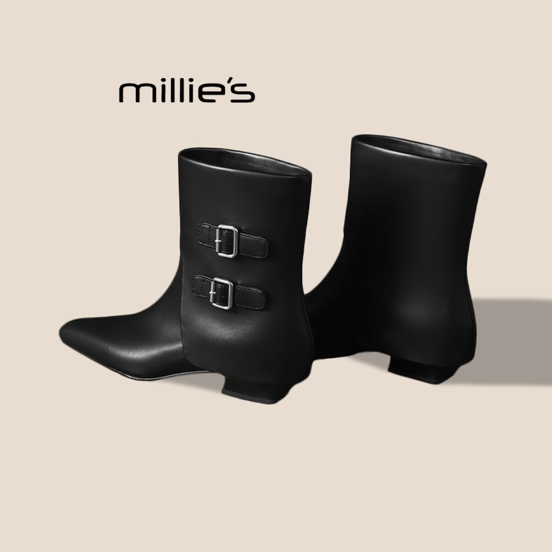 MILLIE'S/妙丽皮带扣马丁靴冬款英伦风粗跟裤管显瘦小方头短靴女Z