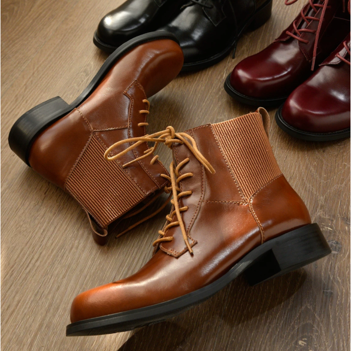 特 女士针织拼接厚底真皮靴子 复古圆头粗跟英伦风马丁靴冬款k