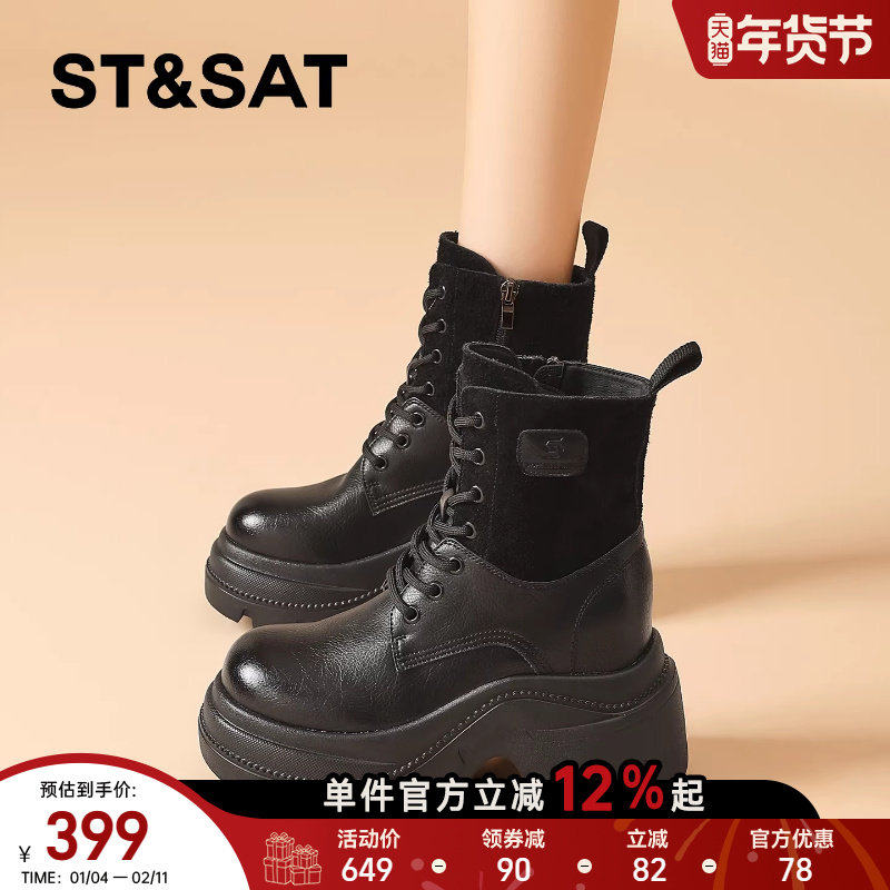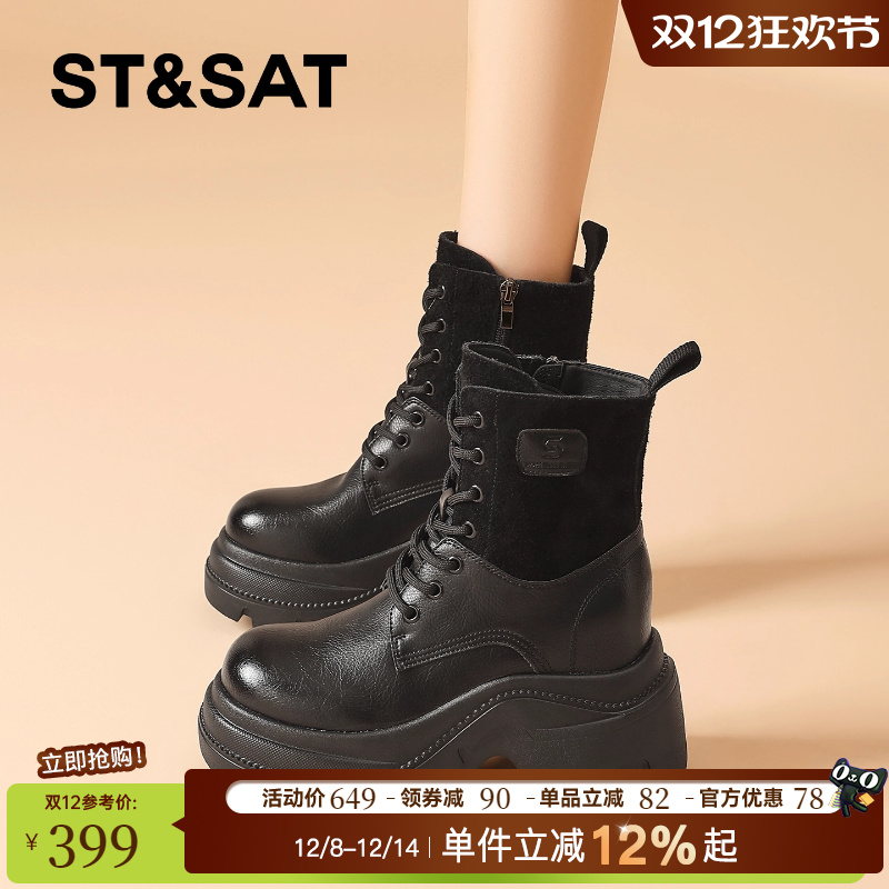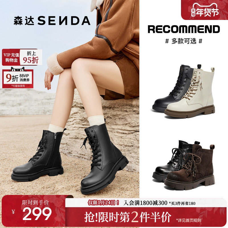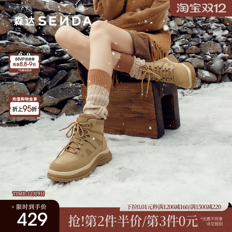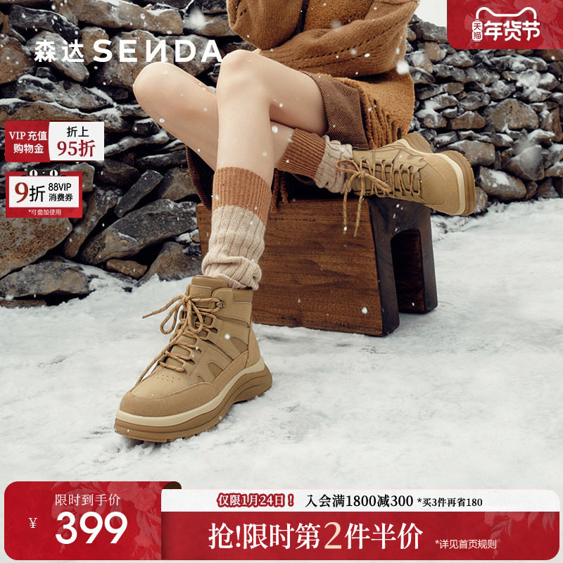 森达真皮马丁靴女冬款商场同款时尚英伦绒里厚底工装中筒靴XEC01