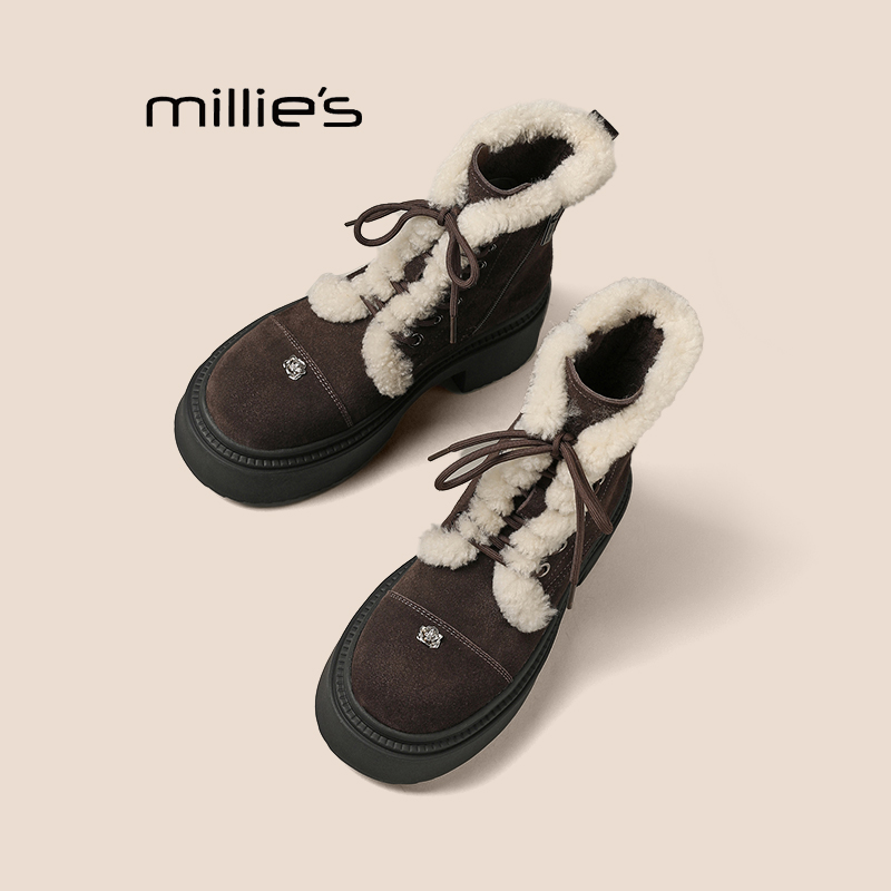 MILLIE'S/妙丽女真皮粗跟马丁靴冬款复古中跟冬季加绒短筒靴棉靴Q