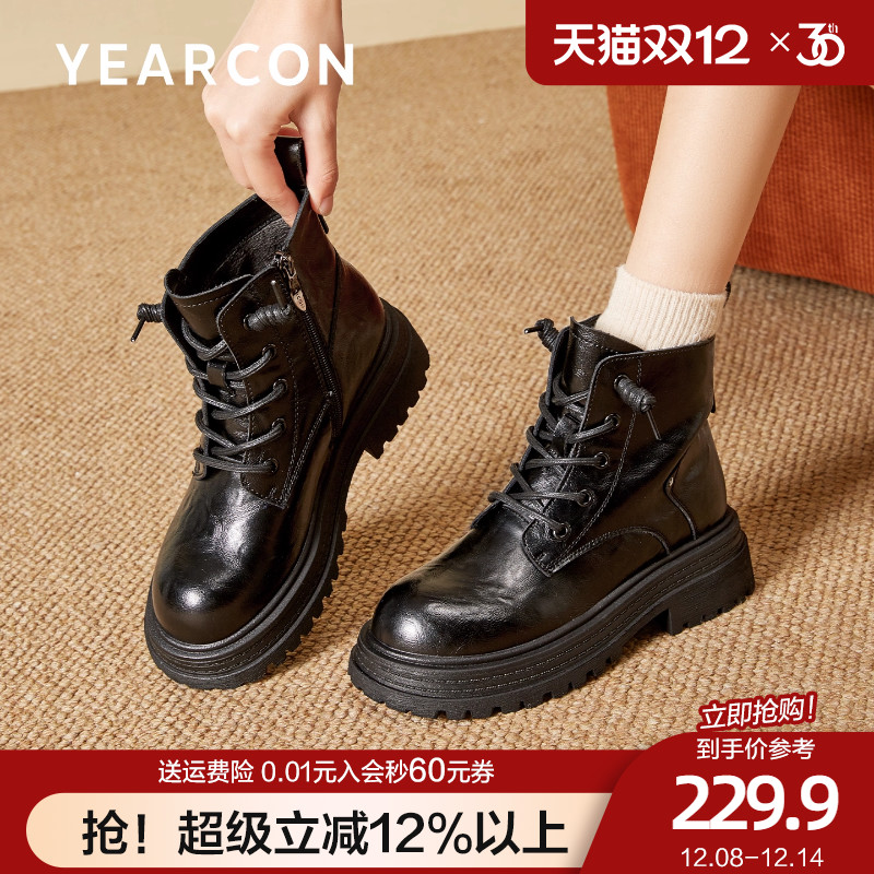 意尔康户外登山马丁靴女2025秋冬款英伦风加绒短靴增高小个子靴子